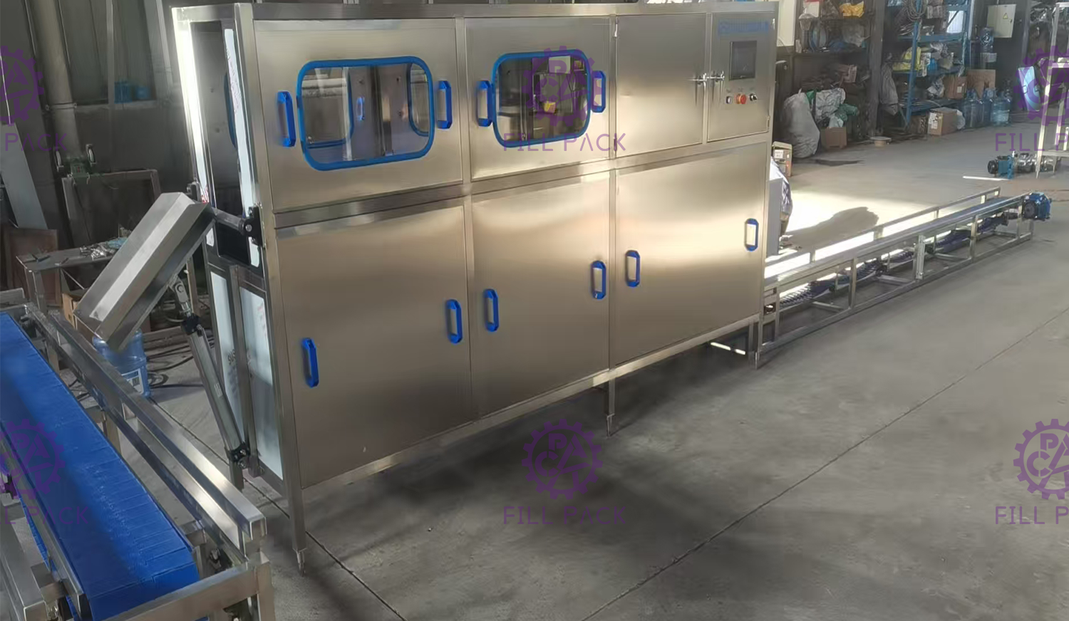 Линия всей воды ведра заполняя включает Полу-автоматические де-каппер и шайбу, ринсер-заполнител-каппер Моноблок, транспортер ролика, тоннель сокращения ярлыка, свет проверки, машину кодирвоания крена твердых чернил