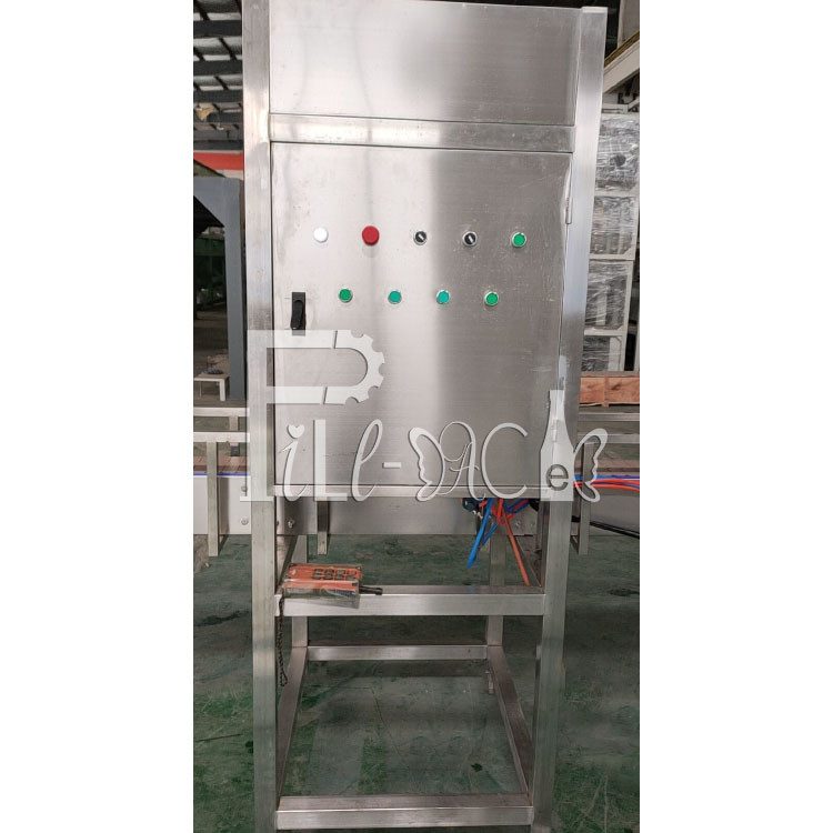 Когда бутылка галлона придет в машину, де-покрывая голова пойдет вниз и царапнуть прибор будет держать плотно стороны крышки бочонка, и после этого будет поднимать бочонок для того чтобы принять крышки; И когда крышки будут приняты, воздух компрессора дунет крышки в хоппер крышки, тогда падение снаружи в собственный держатель клиента;